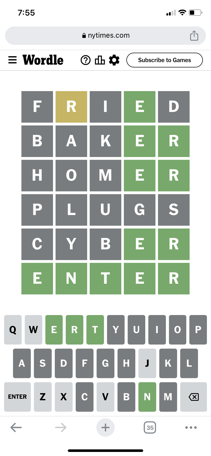 Although I knew for a fact that this was not the word I was looking for, there was method to my madness - find all the vowels and eliminate as many other letters as possible. It worked! Somewhat. Although I was no closer to solving the puzzle, I had whittled down the remaining letters to QWTYJZXCVBN + E & R which were already on the board.